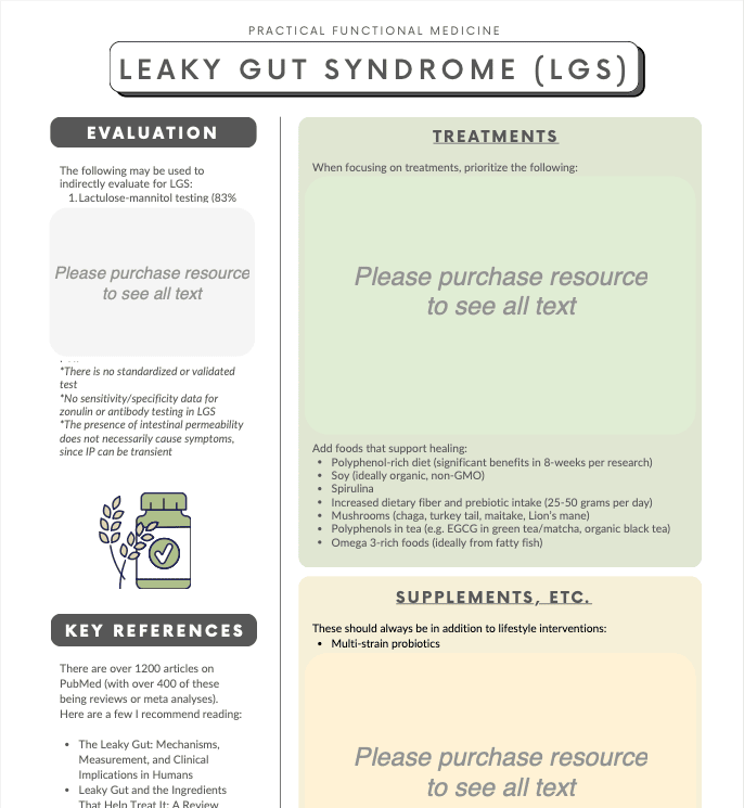 A 2-page summary of evidence-supported research as well as evaluation and treatments for leaky gut syndrome ("LGS"). Your receipt email will also include 5 pages of research with links, in case you want to peruse the articles and learn more!